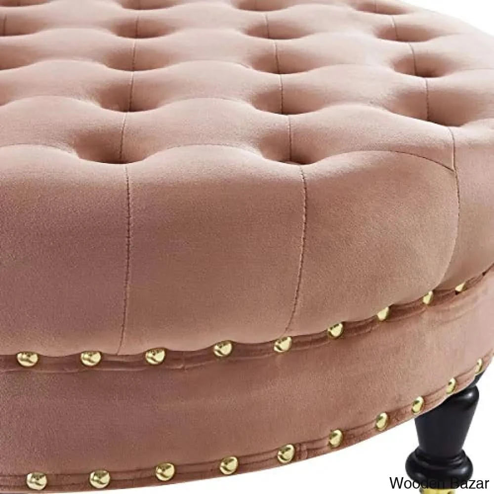 Details: Fashionable style to your home with this elegant round ottoman. Crafted from sturdy hardwood with linen upholstery, copper nail head accents on the edges for a fascinating outlook. This ottoman features a tufted seat design for an extra touch of luxury, use it as a foot rest, a comfortable seat, or a surface to place items such as magazines and serving trays or an accent piece to complement your decor. Embedded solid wood supports heavy capacity and longer use. Material : Solid wood fram+TB117 Foam+ Velvet fabric+ Metal ; Product Size: 30.25”D X 18”H