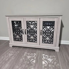This 45'' sideboard blends traditional elegance with everyday functionality. Made from manufactured wood, it features three cabinet doors with ornate wrought iron-style overlays and mirrored panels that brighten any room. Inside, adjustable shelves provide flexible storage for dinnerware, media, or household essentials. Perfect for the dining room, living room, or entryway, it offers a stylish and practical storage solution.