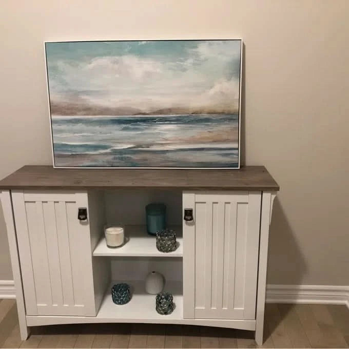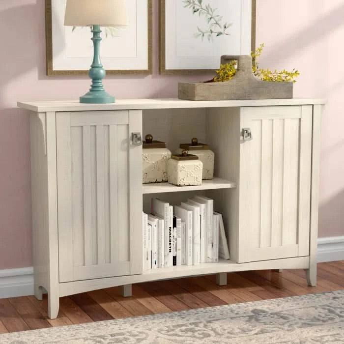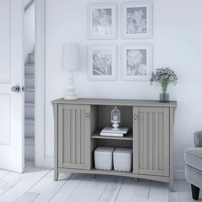 Add relaxed charm and practical storage to any room with the Bush Furniture Salinas Accent Storage Cabinet. Inspired by classic Mission style, it features two doors with vertical wood accents and Tumbled Pewter hardware, plus an open shelf and cubbies for display. Behind each door is an adjustable shelf, perfect for customizing storage. Ideal for the home office, entryway, or living room, this cabinet blends casual style with everyday function.