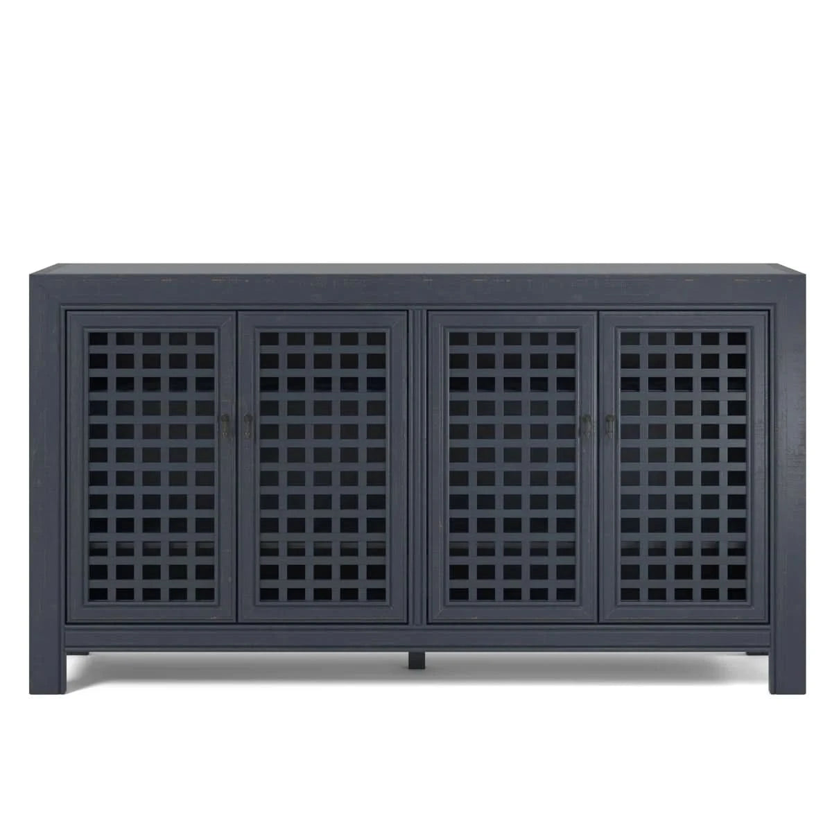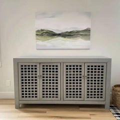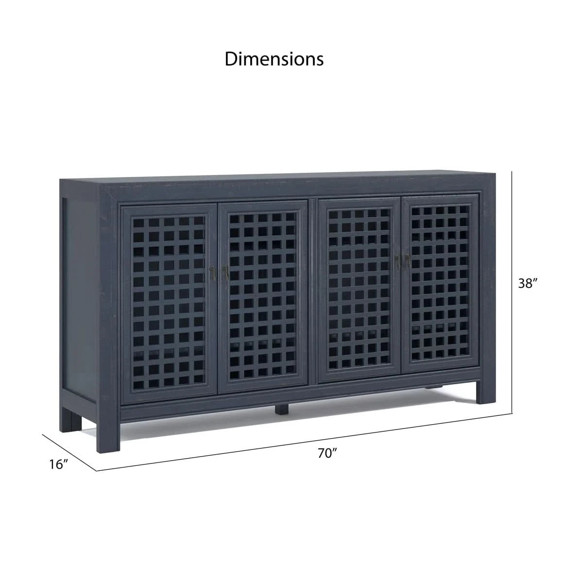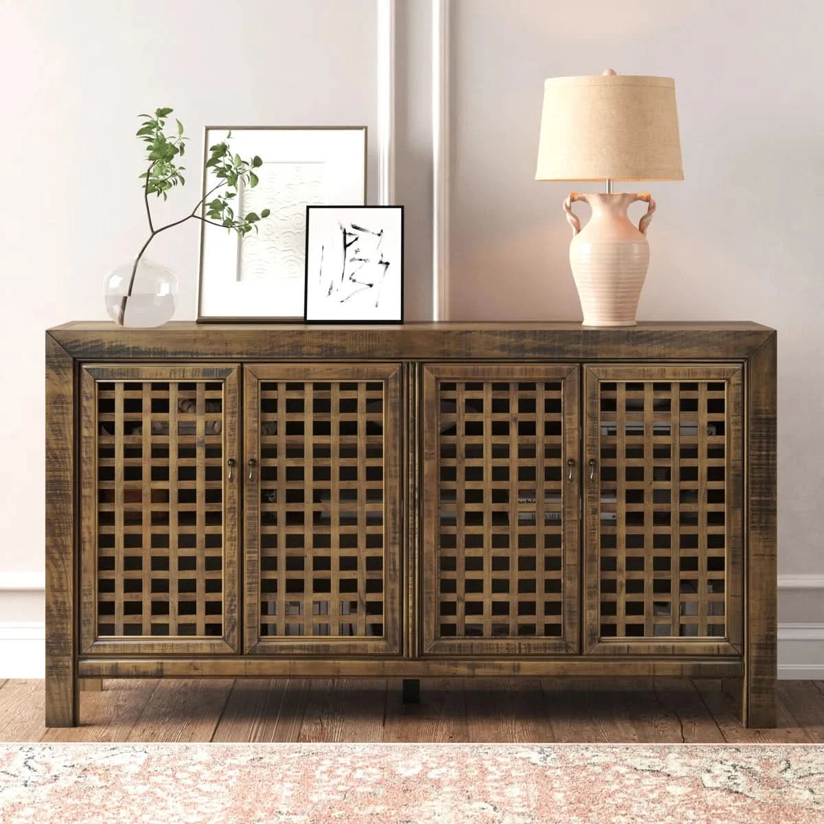 Add timeless charm with this 70" vintage sideboard, crafted from solid pine wood with a neutral, weathered finish. Lattice-style double doors open to reveal adjustable shelves—perfect for barware, dinnerware, or linens. The spacious top offers room to serve, display, or style your favorite decor.
