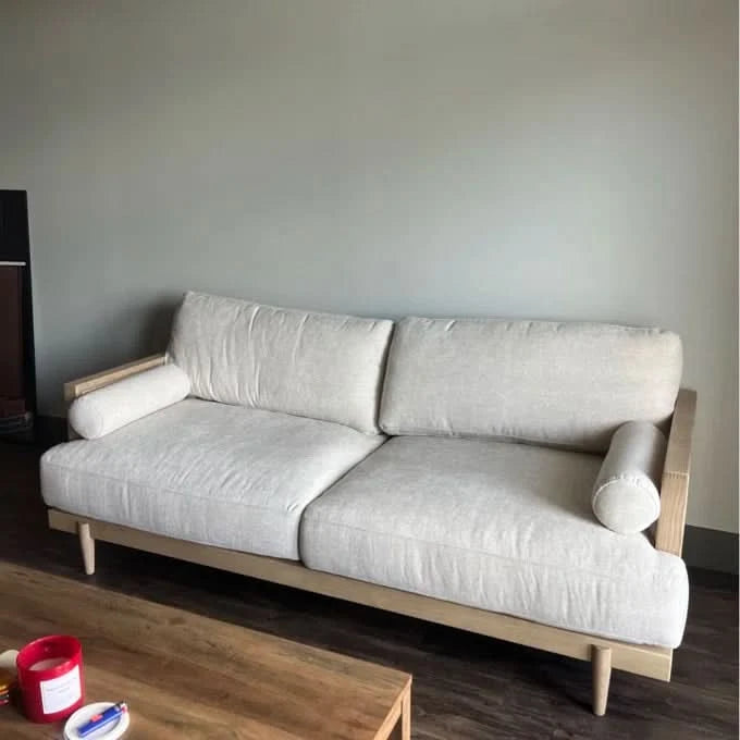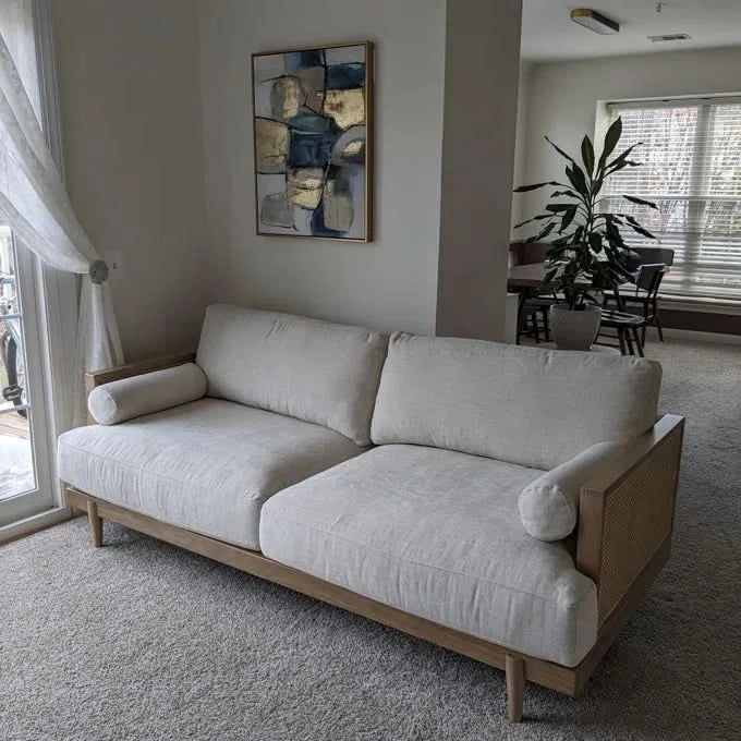 Sit back and relax. With sleek ash wood trim, rattan accents, and plush feather-blend cushions, this sofa blends old Hollywood charm with modern comfort. Soft fabric, deep seats, and clean lines make it the perfect spot to lounge in style.