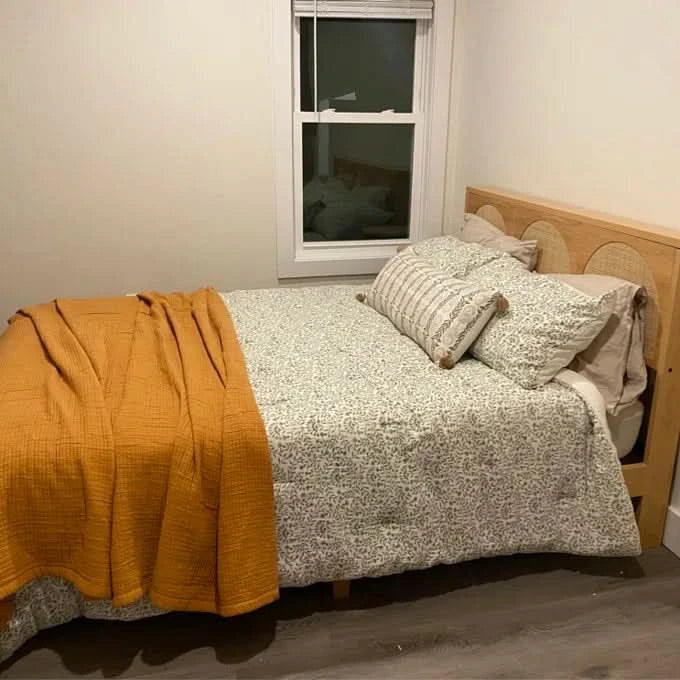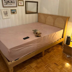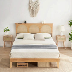 This rattan headboard bed combines natural charm with modern features. Crafted from premium rattan, it includes 6 sturdy wooden legs, a reinforced iron frame, and 12 durable slats for strong support. A built-in LED light strip behind the headboard offers multiple color options to create a cozy ambiance. With 8 inches of under-bed storage, it’s perfect for keeping your bedroom neat and organized.