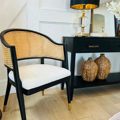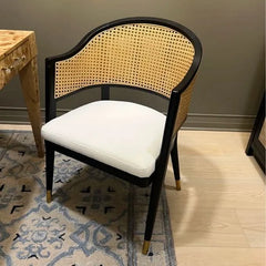 The dining chair reimagines a mid-century design icon for today’s contemporary chic interiors. The curved rattan back, black stiletto-inspired wood frame, and glamorous brass caps make it a bold, stylish statement piece in any modern dining room.