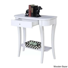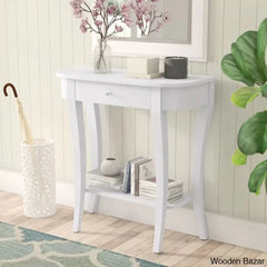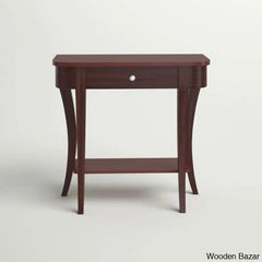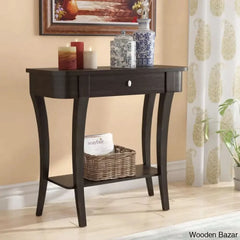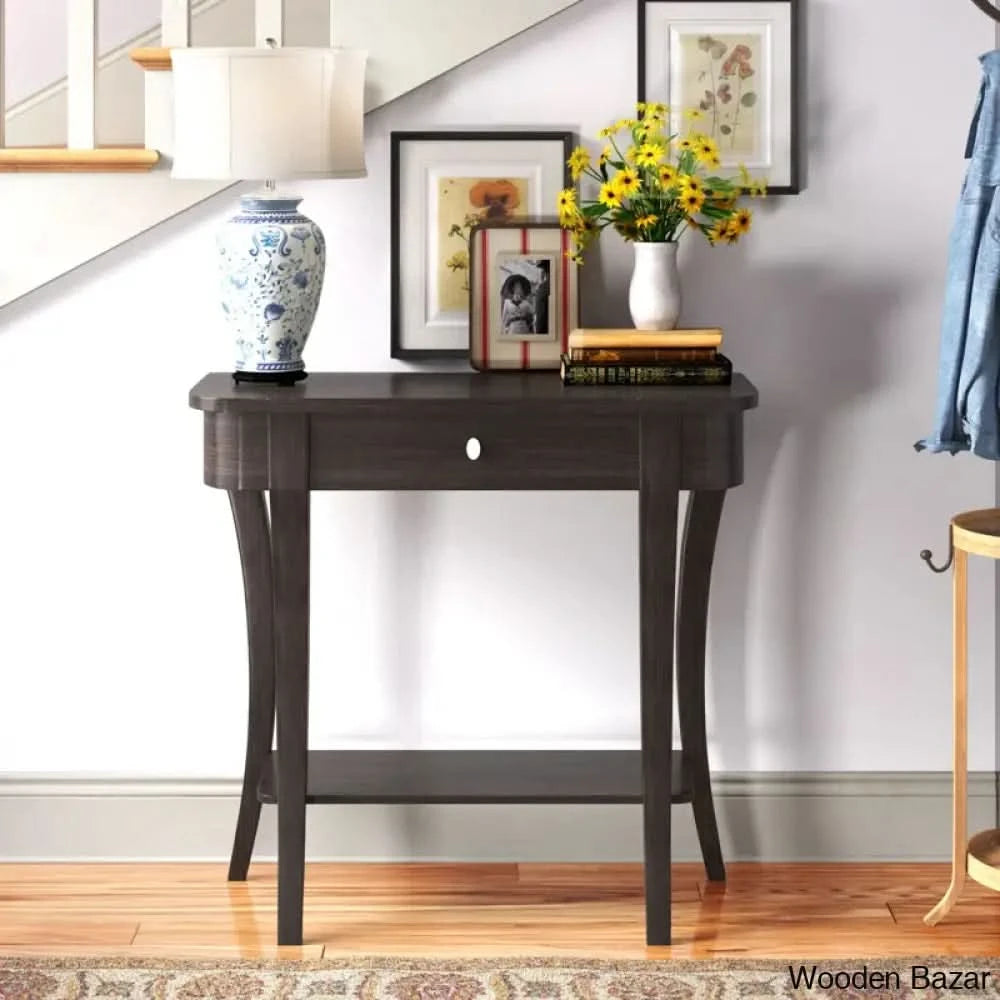 This sophisticated console table, with its clean-lined square tabletop and four curved legs, has a modern form. It is made of engineered wood with a dark espresso finish. A pull-out drawer with an oval knob provides out-of-sight storage for matches, lighters, batteries, or candles, while a lower shelf is ideal for holding a stack of your favorite novels or magazine issues.
