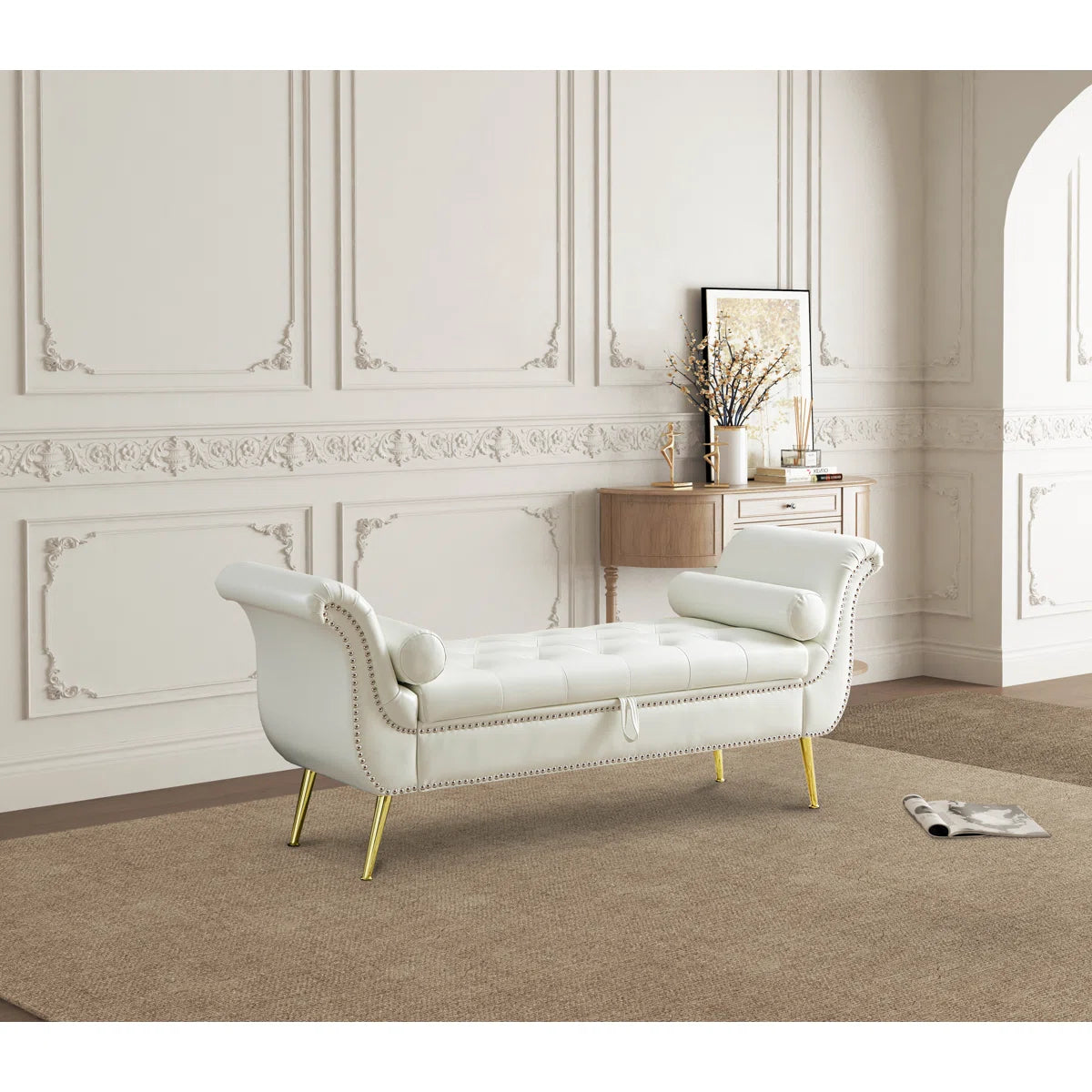 This multi-functional sofa bench is a masterful blend of elegant design, comfortable seating, and clever functionality. Adorned with classic details like button tufting and nailhead trim, and supported by striking golden metal legs, it serves as a sophisticated accent piece. Beyond its looks, it offers a hidden storage compartment and comes complete with matching pillows, making it a perfect and practical addition to any entryway, living room, or bedroom.