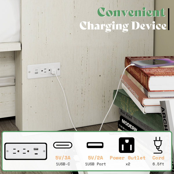 Farmhouse Murphy Bed, Large Storage Drawer & Charging Station