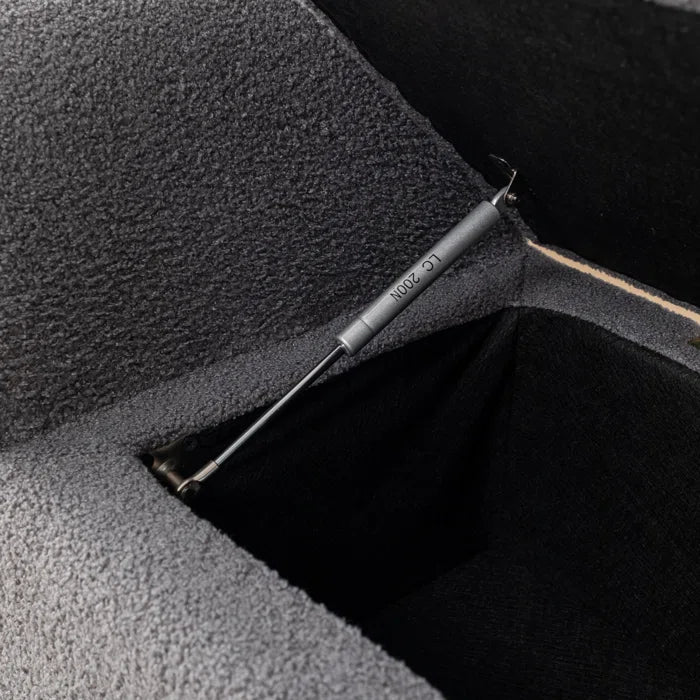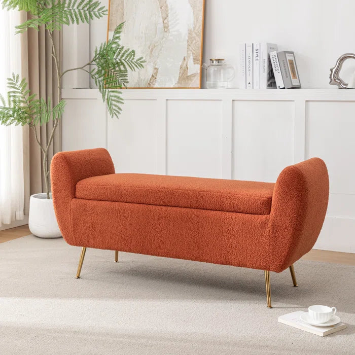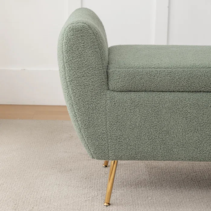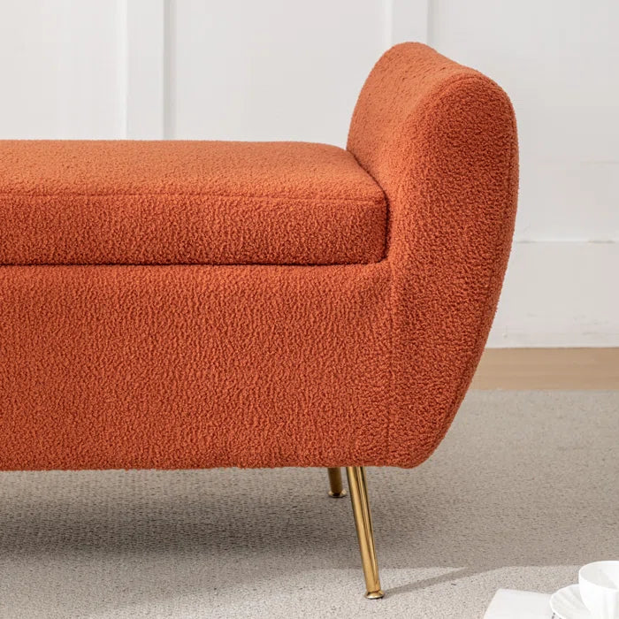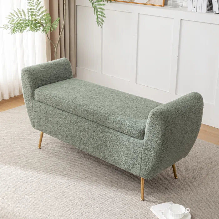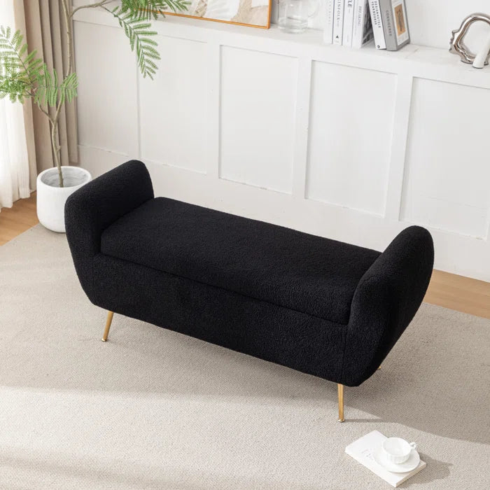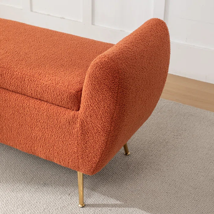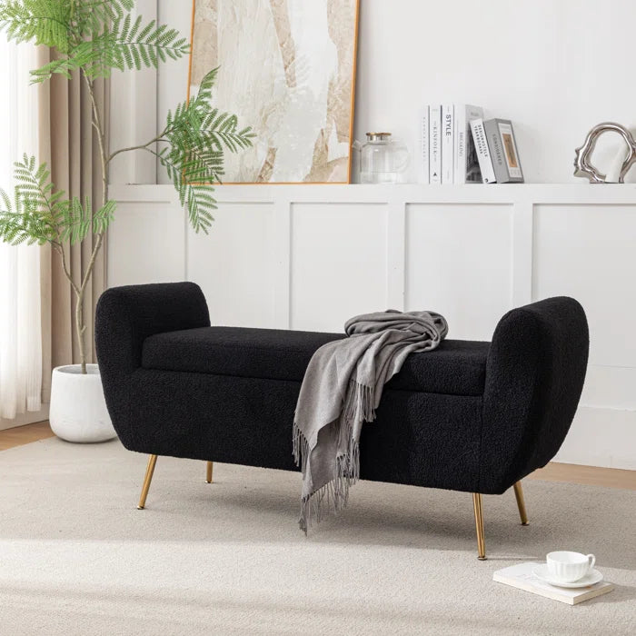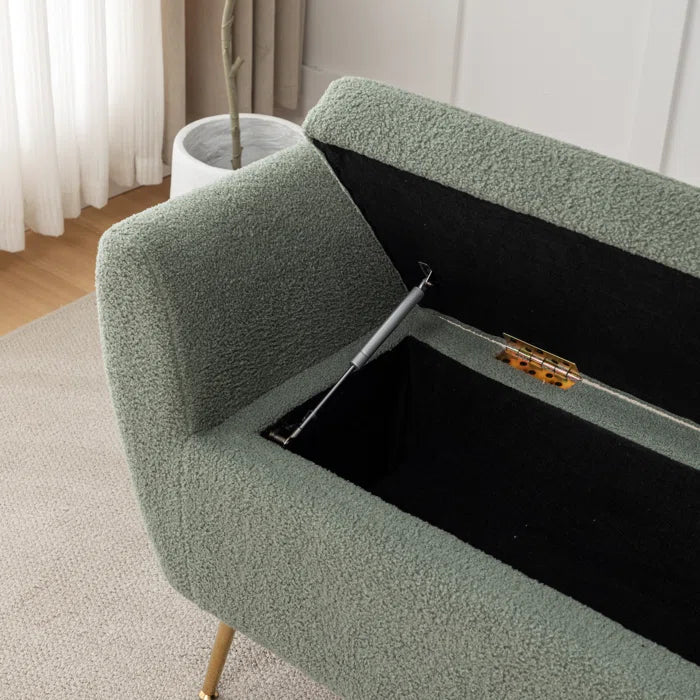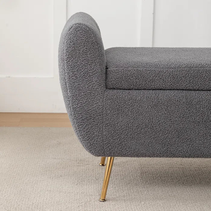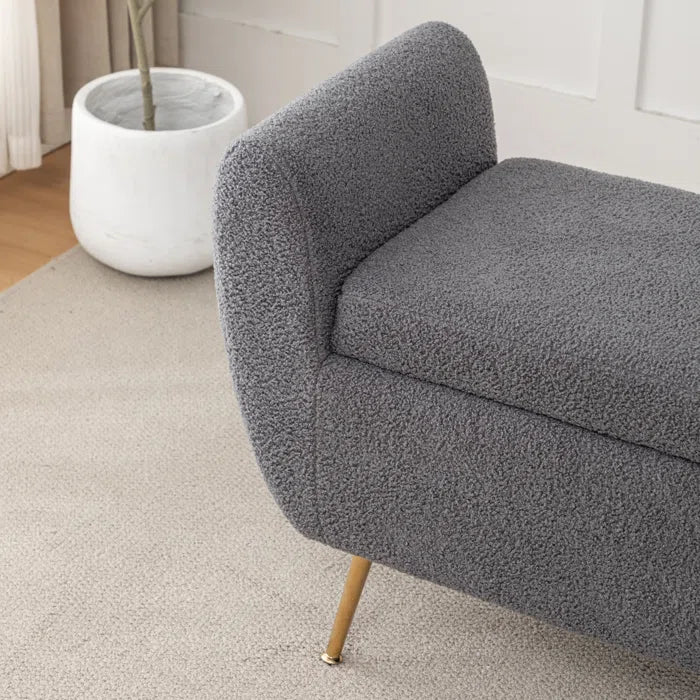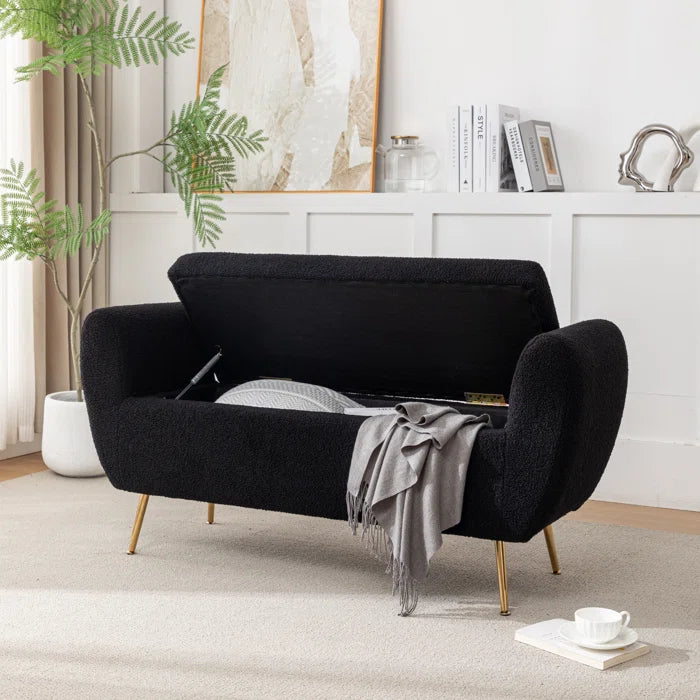 In essence, this storage bench is a functional and decorative piece of furniture that provides comfortable seating for two, ample hidden storage, and a touch of modern glam style with its gold legs and bouclé-like fabric.