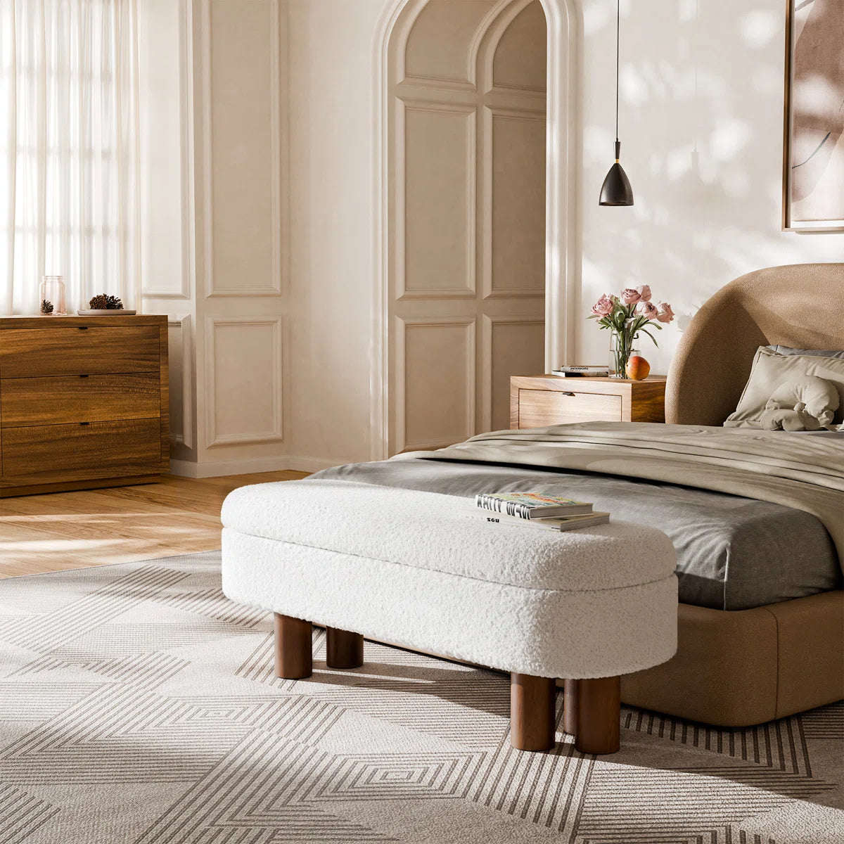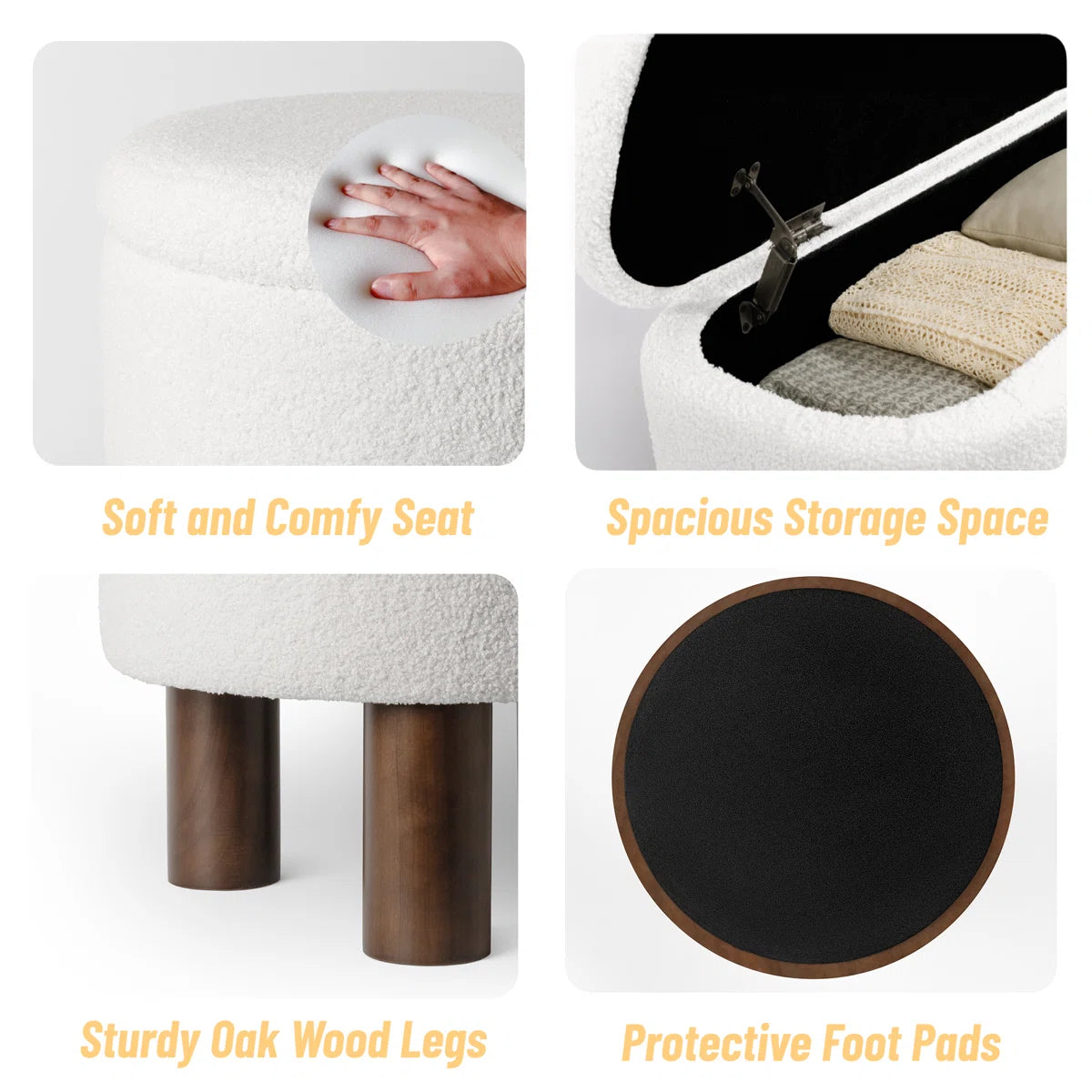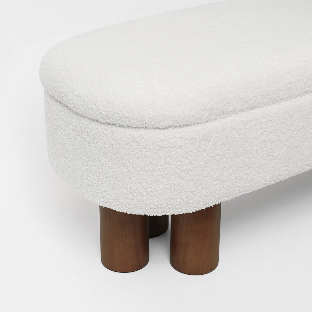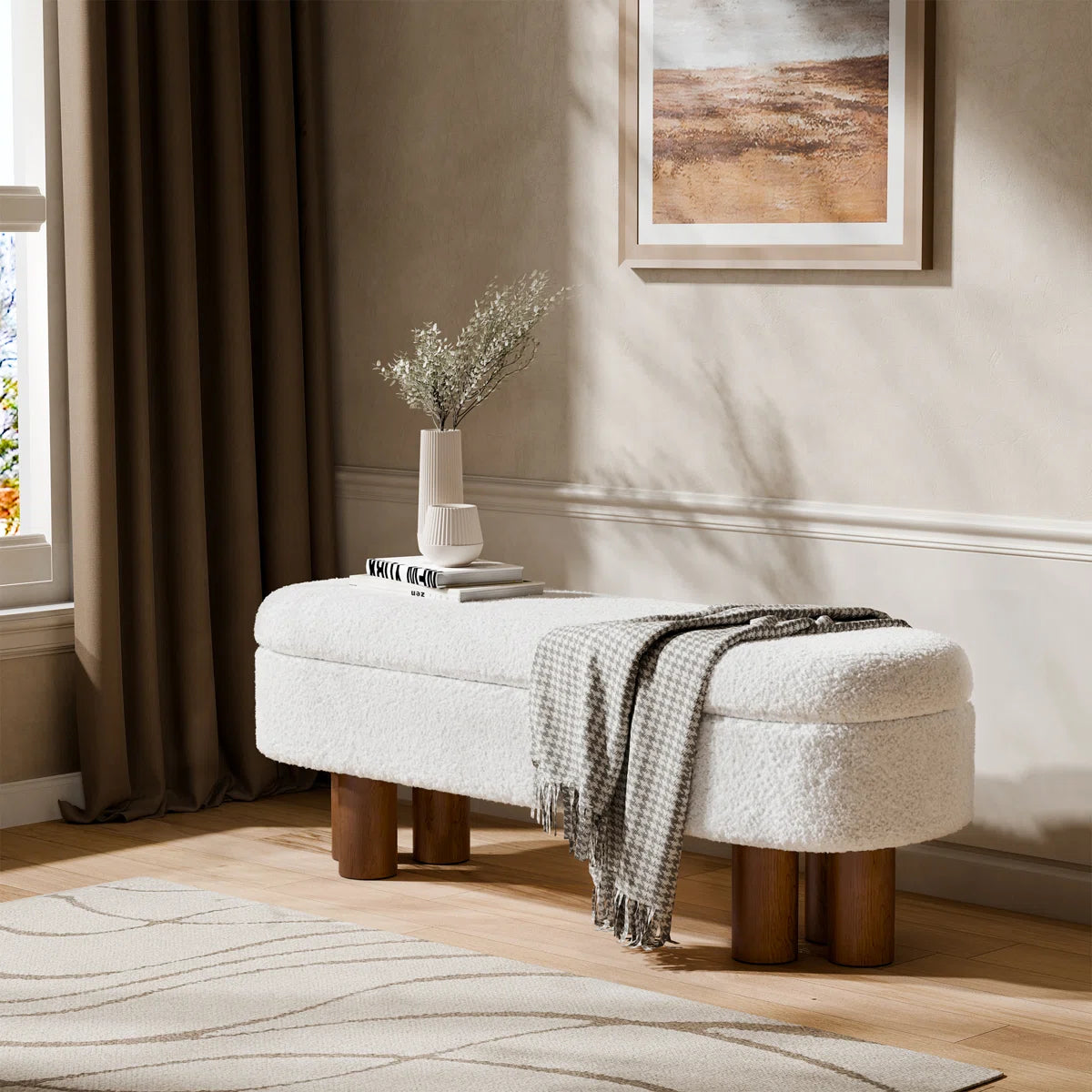 Overview Embrace Scandinavian comfort and minimalism with this upholstered flip-top storage bench. Wrapped in soft boucle and supported by six solid oak cylinder legs, it offers plush, supportive seating with high-density foam and a generous hidden compartment for clutter-free living. Perfect at the foot of a bed or as an elevated accent in entryways, hallways, living rooms, closets, or lounge areas.