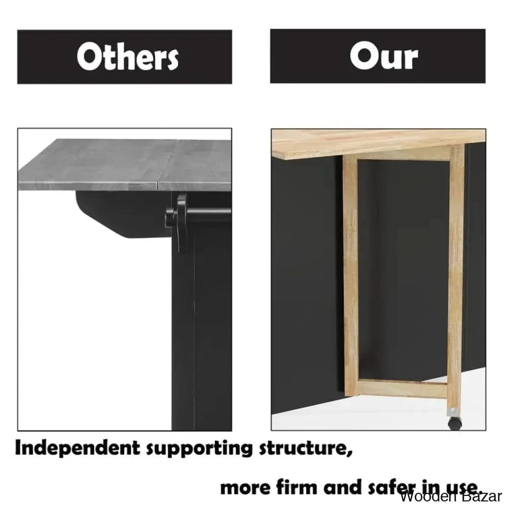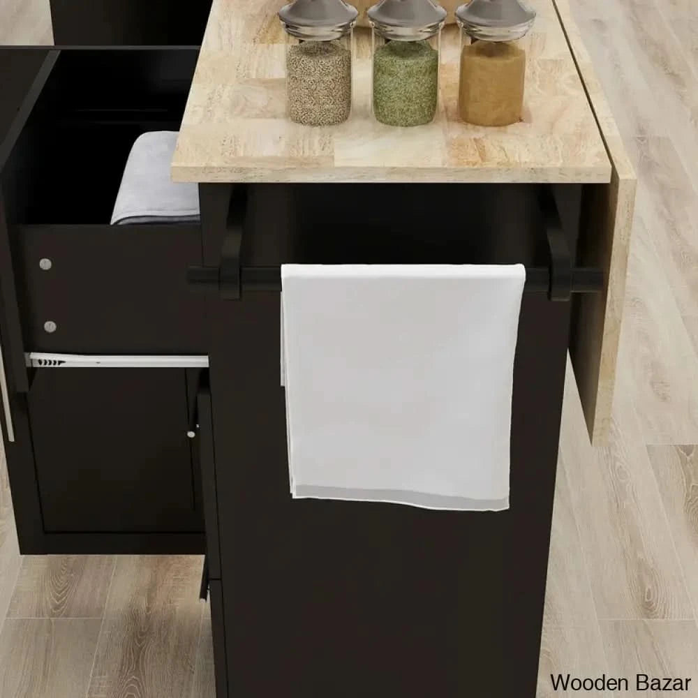 Pairing function with fashion, this kitchen island is sure to tie your space together while offering room to store and showcase entertaining essentials. Crafted from solid and engineered wood with a traditional two-tone finish, this cart includes a drop-down leaf to maximize prep space or create a standout breakfast bar. Three drawers and a double-door cabinet with three interior shelves help you organize dinnerware and dry ingredients. There's also a towel rack along with extra space for smaller accessories on either end. Wheels allow you to steer this kitchen island around wherever you need it and lock it in place.