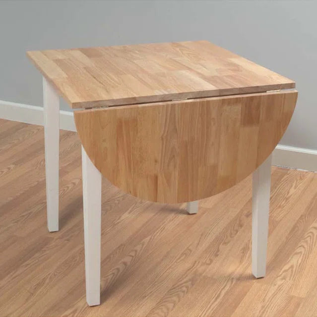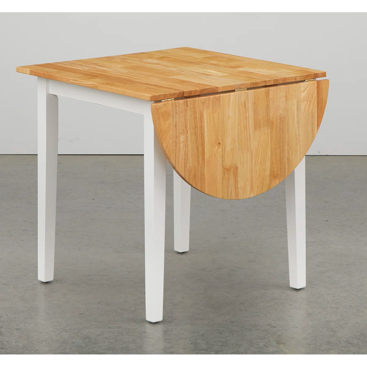 Ideal for cozy spaces, this delightful Castellon Drop Leaf Rubber Solid Wood Dining Table offers traditional appeal with an efficient footprint. Made from solid rubberwood, this charming design features a clean-lined tabletop with four tapered square legs. A half-a-circle drop-leaf easily converts a two-person table to comfortably accommodate three, while the opposite straight edge allows you to place the table flush with a wall. To maximize space in the eat-in kitchen, start by rolling out a rustic linen area rug for a pleasant pop of pattern, then place this table by a brightly lit window to enjoy weekend breakfasts in the summer breeze. Top the table with a gingham runner and a hand-painted ceramic vase of freshly cut petunias for a floral centerpiece for any occasion.