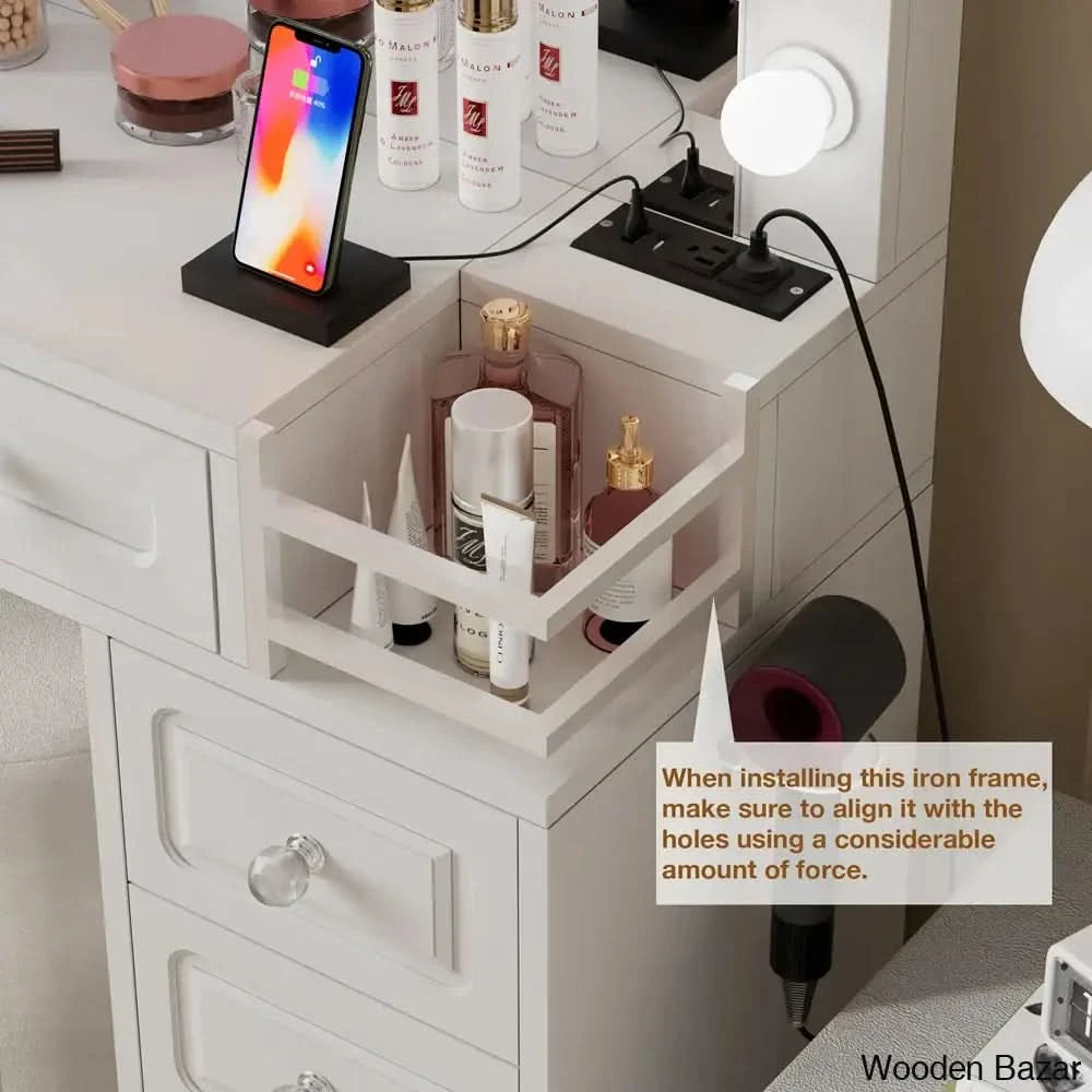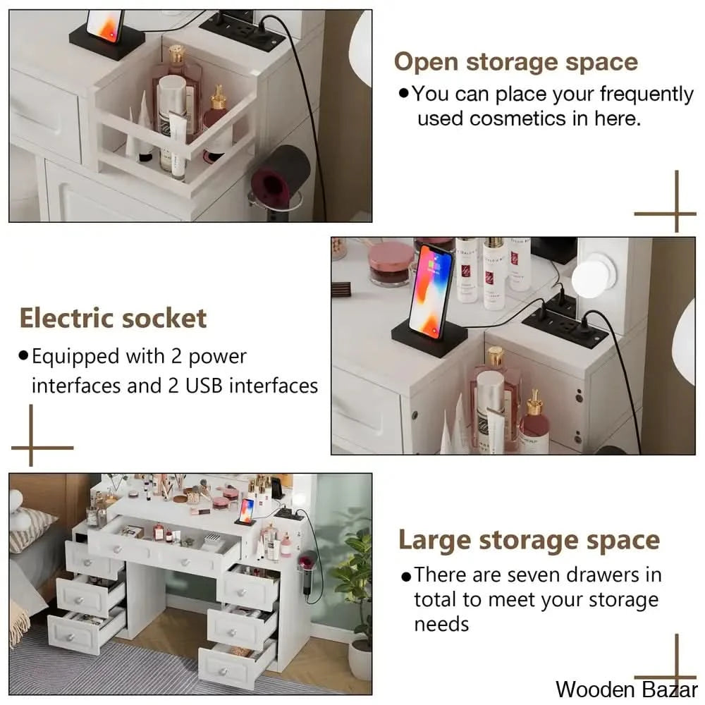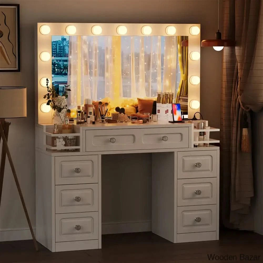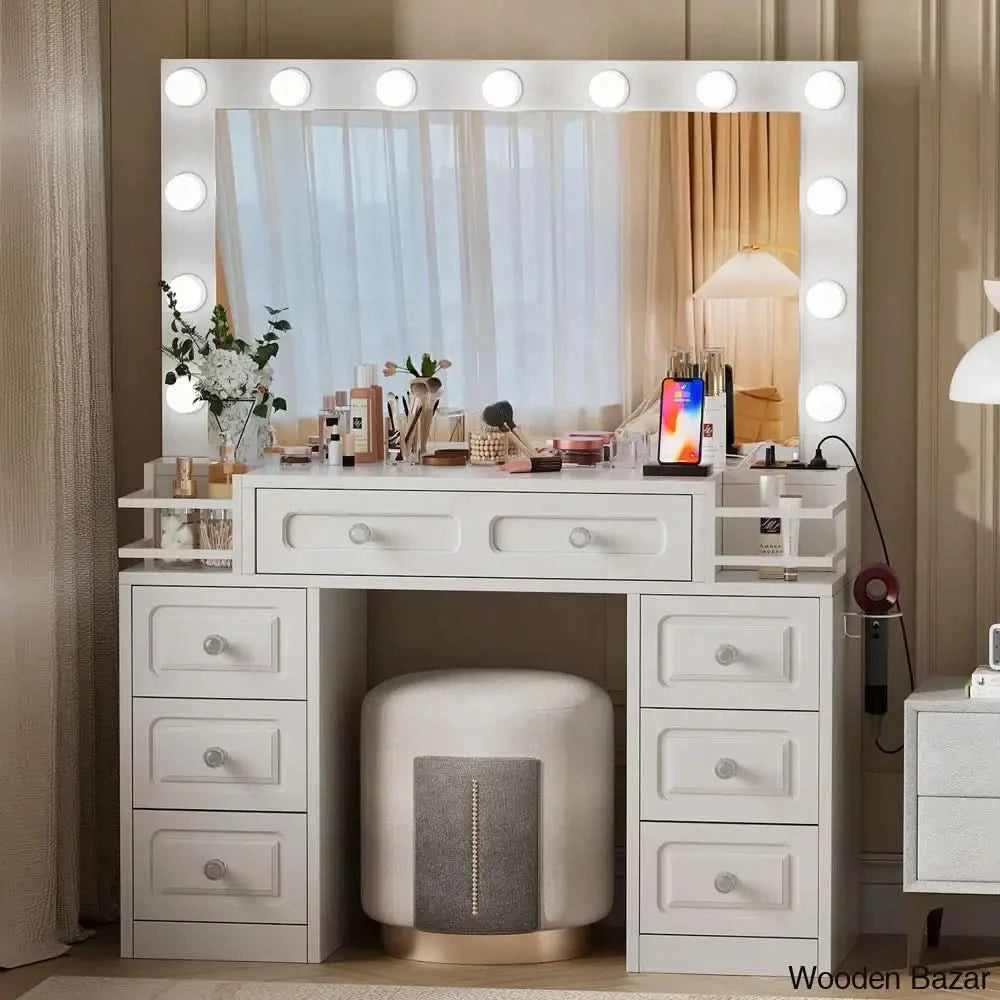- White Vanity with Charging Station: This modern vanity table includes 13 light bulbs, 2 standard plug sockets, 2 USB ports, and a hair dryer holder, making it convenient to use hair styling tools and charge mobile devices.