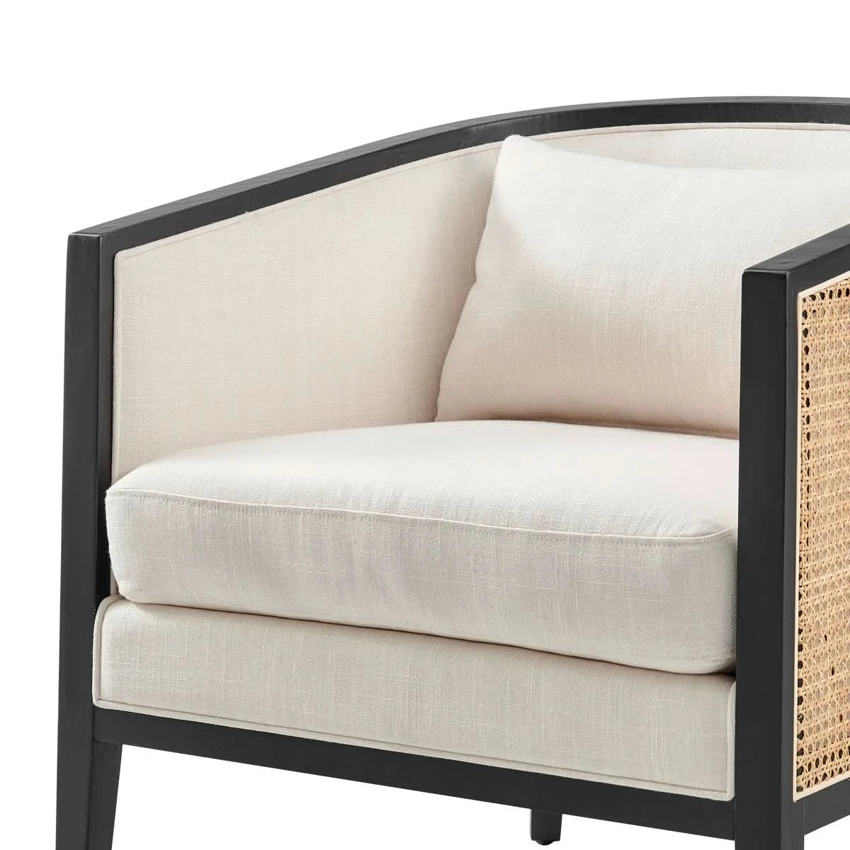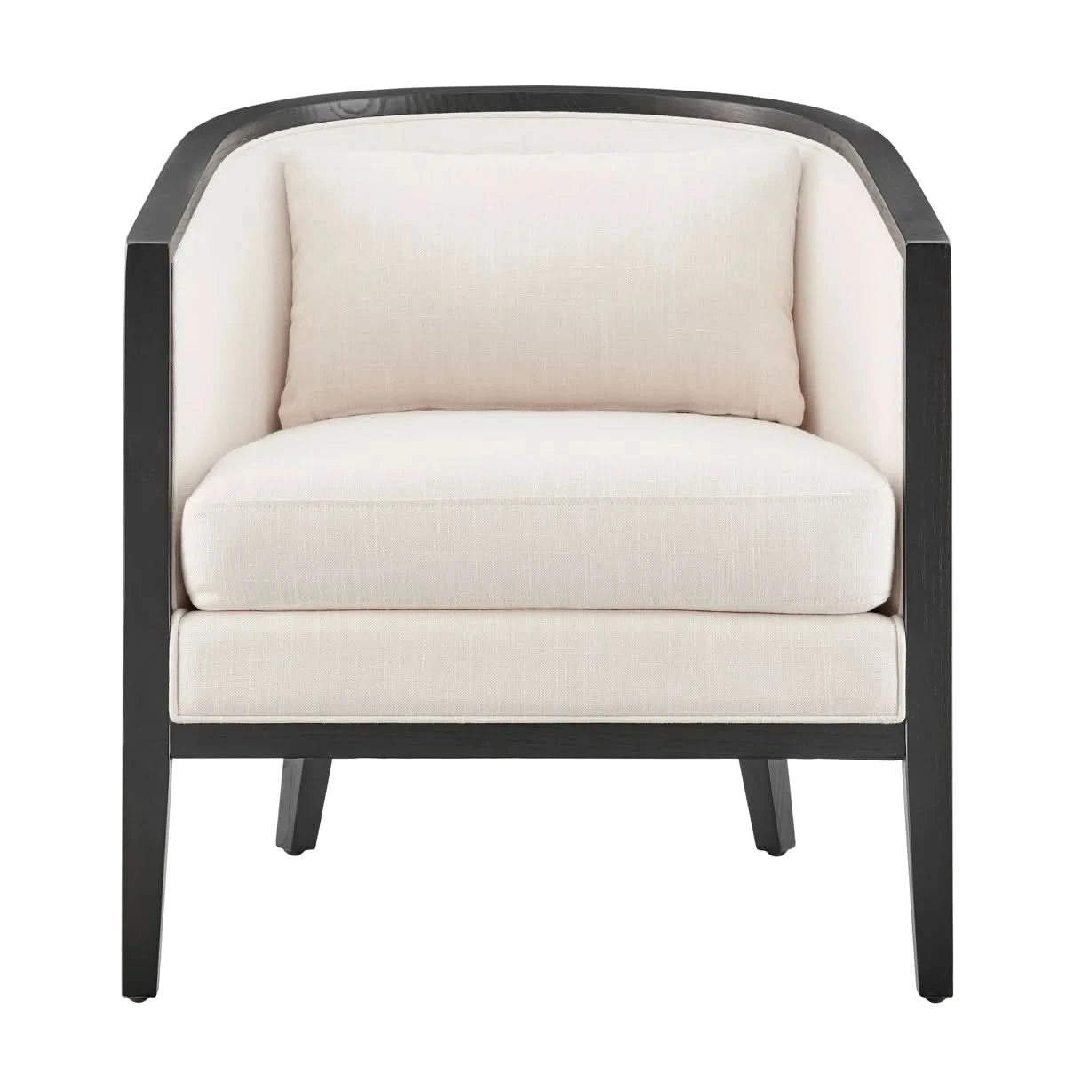Blending bold curves with breezy coastal charm, this barrel-style armchair is a stylish addition to any living space. The gently rounded frame is crafted from a mix of solid and engineered wood for lasting support and durability. Resting on four modern tapered legs, it brings a touch of mid-century flair. Upholstered in a soft, natural-toned fabric and filled with plush foam, the chair offers just the right balance of comfort and support. A deep, generously sized seat invites you to relax, while the included accent pillow adds a cozy, decorative touch.