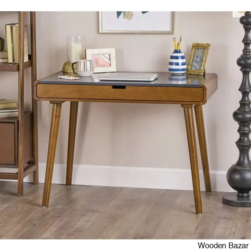 This mid-century desk is the perfect addition to any home office or student's room. This wooden desk features a large drawer in the center of the desk, ideal for storing anything from writing tools to chargers. Large enough to fit a computer and paper, this desk is sure to be everything you are looking to add to your home office.