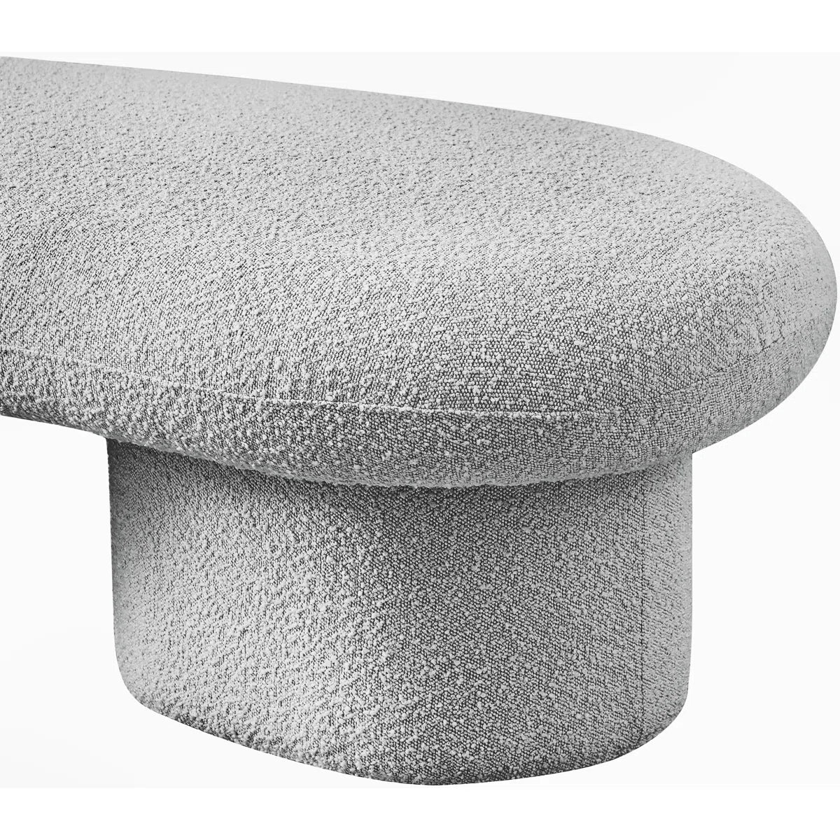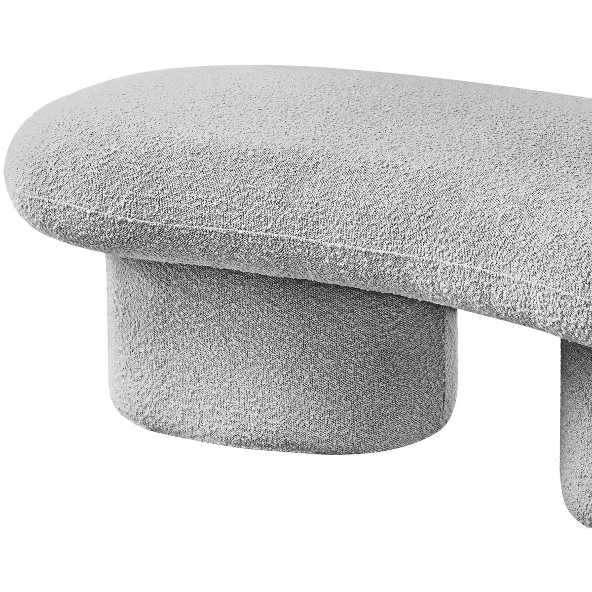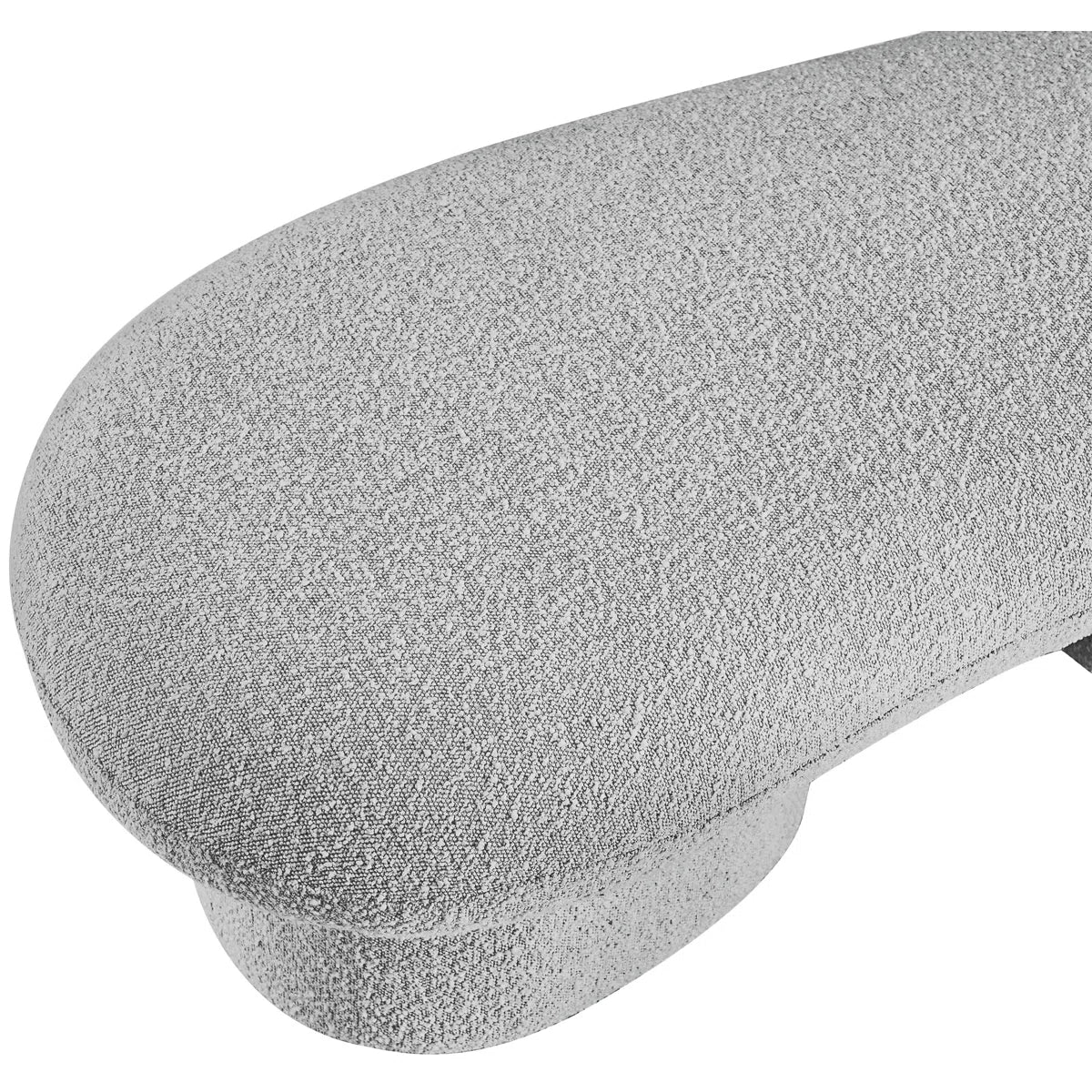 In essence, this bench is a decorative and comfortable piece of furniture designed to be a focal point in a room, offering a blend of tactile richness (boucle fabric) and visual sophistication (curved shape, Art Deco inspiration).