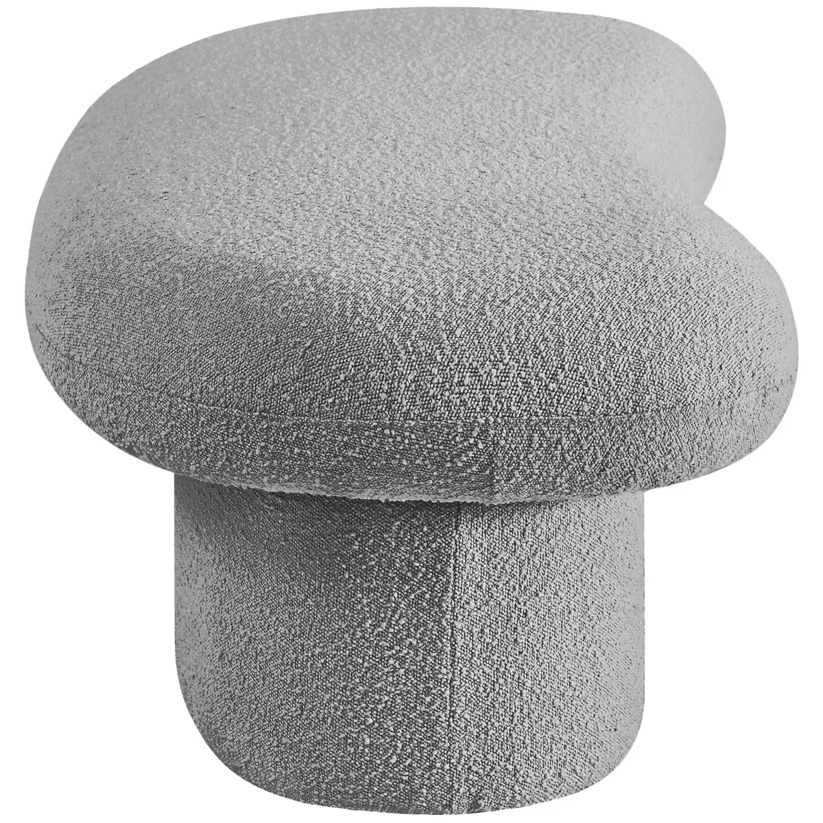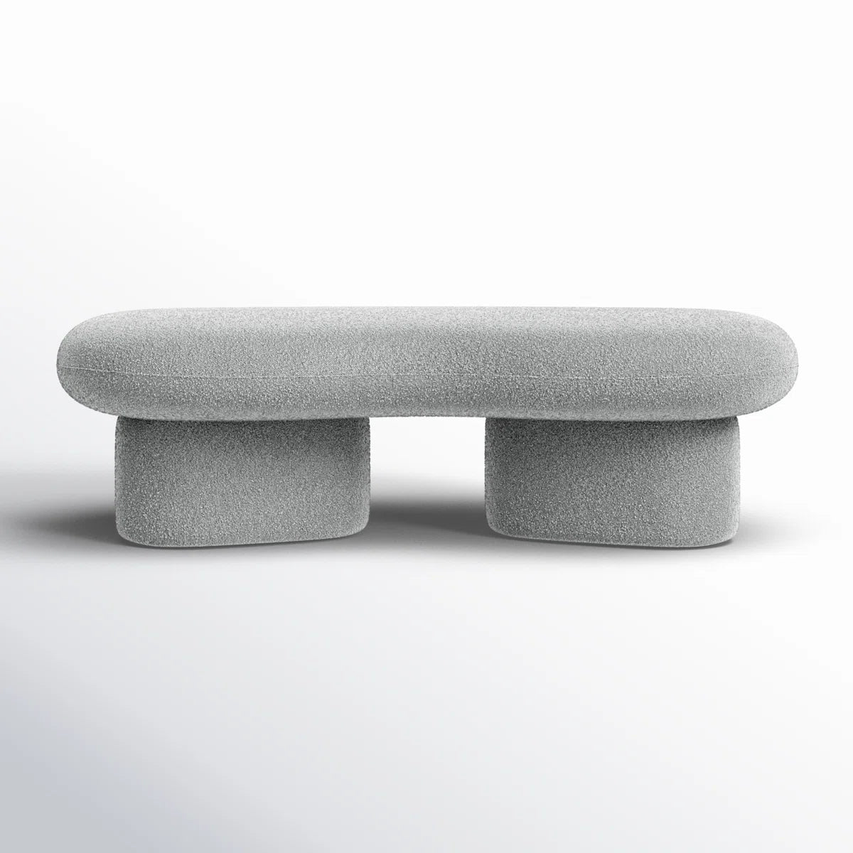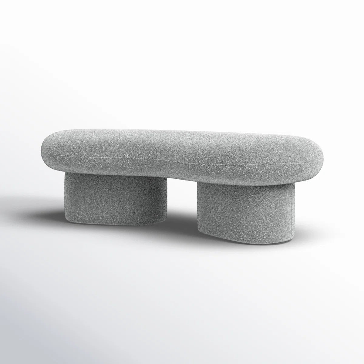 In essence, this bench is a decorative and comfortable piece of furniture designed to be a focal point in a room, offering a blend of tactile richness (boucle fabric) and visual sophistication (curved shape, Art Deco inspiration).