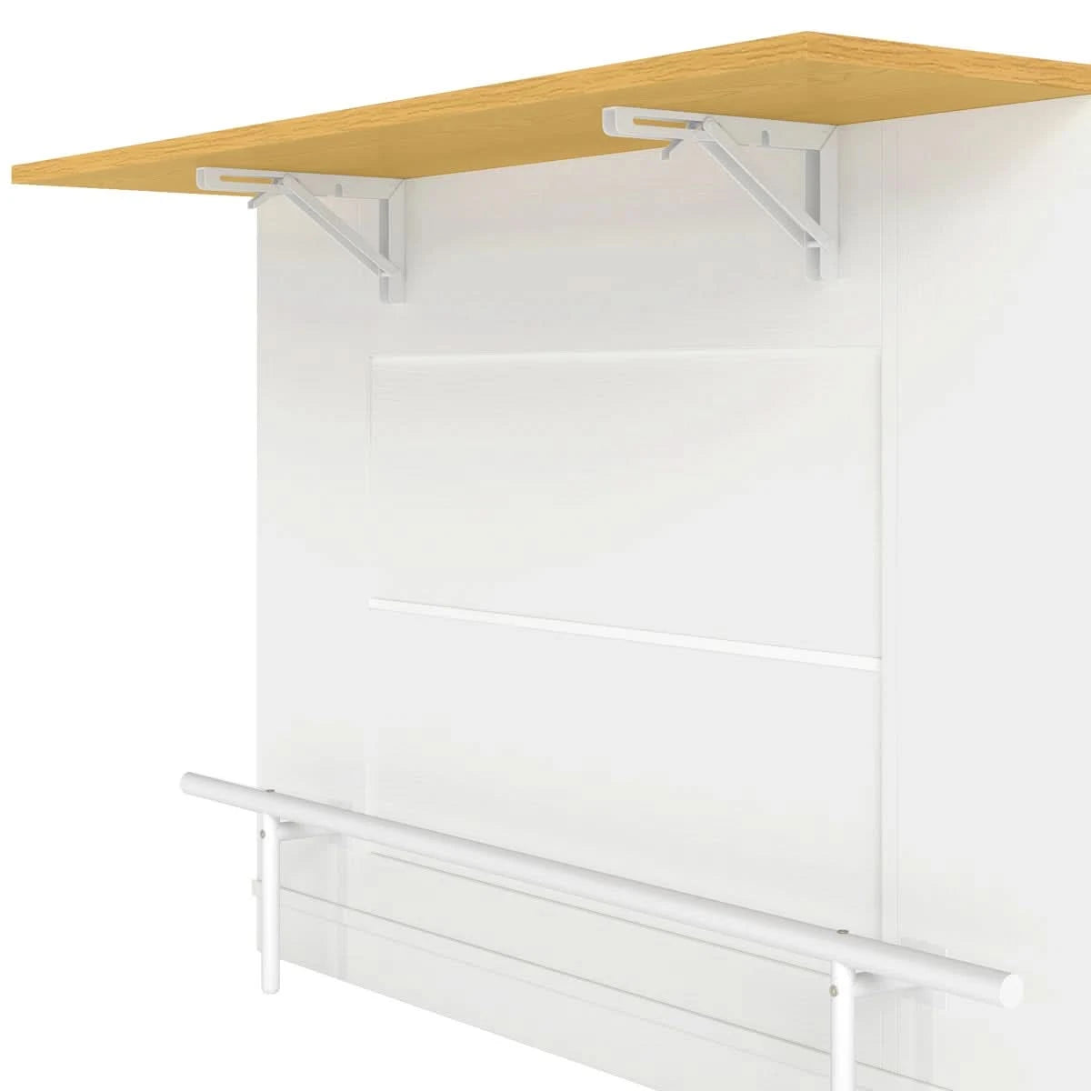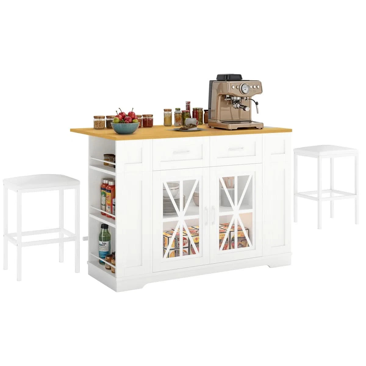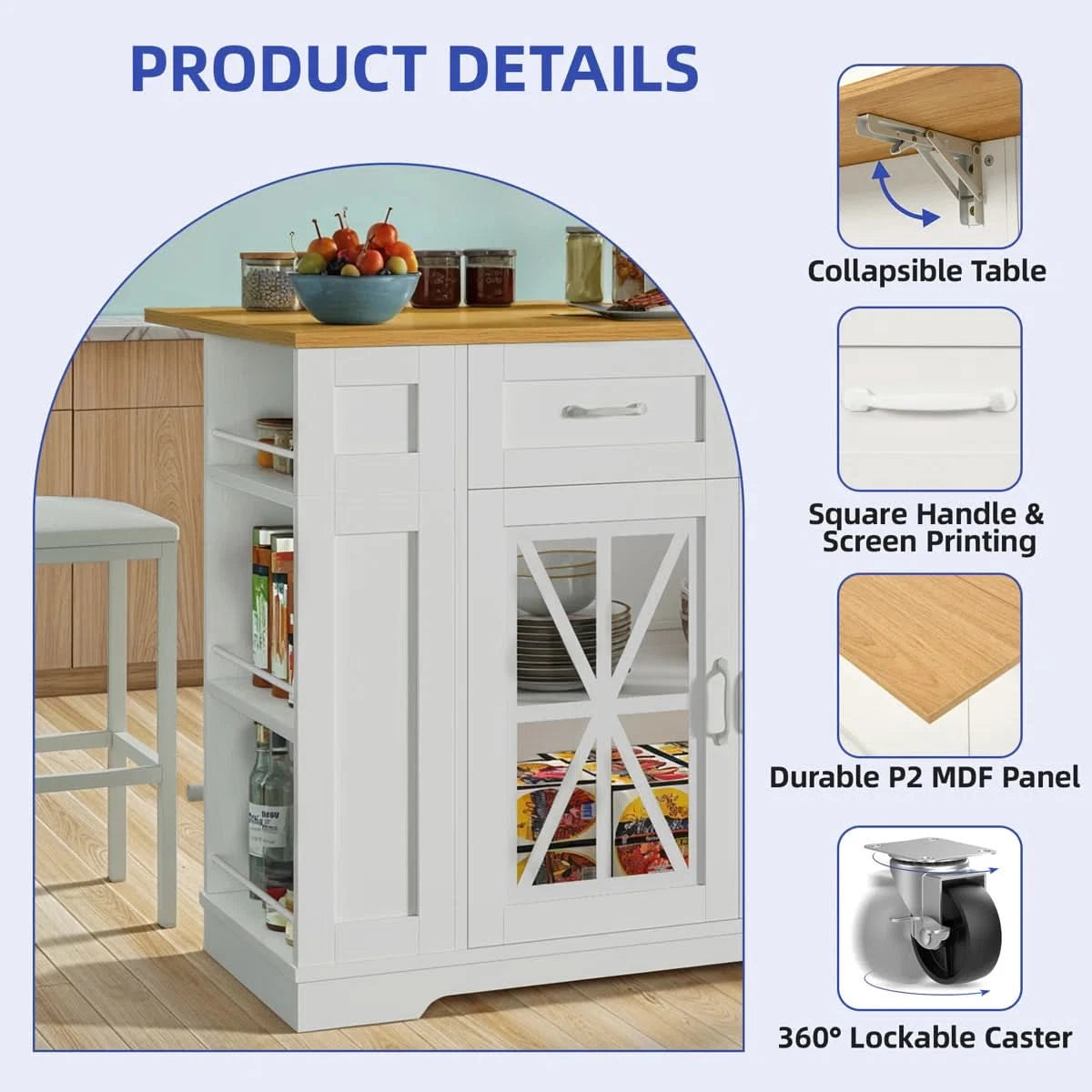 In summary, this kitchen island is a highly functional and adaptable piece of furniture designed to maximize utility in the kitchen by offering ample storage, a convertible dining surface, convenient charging, and easy mobility, all while including the necessary seating.