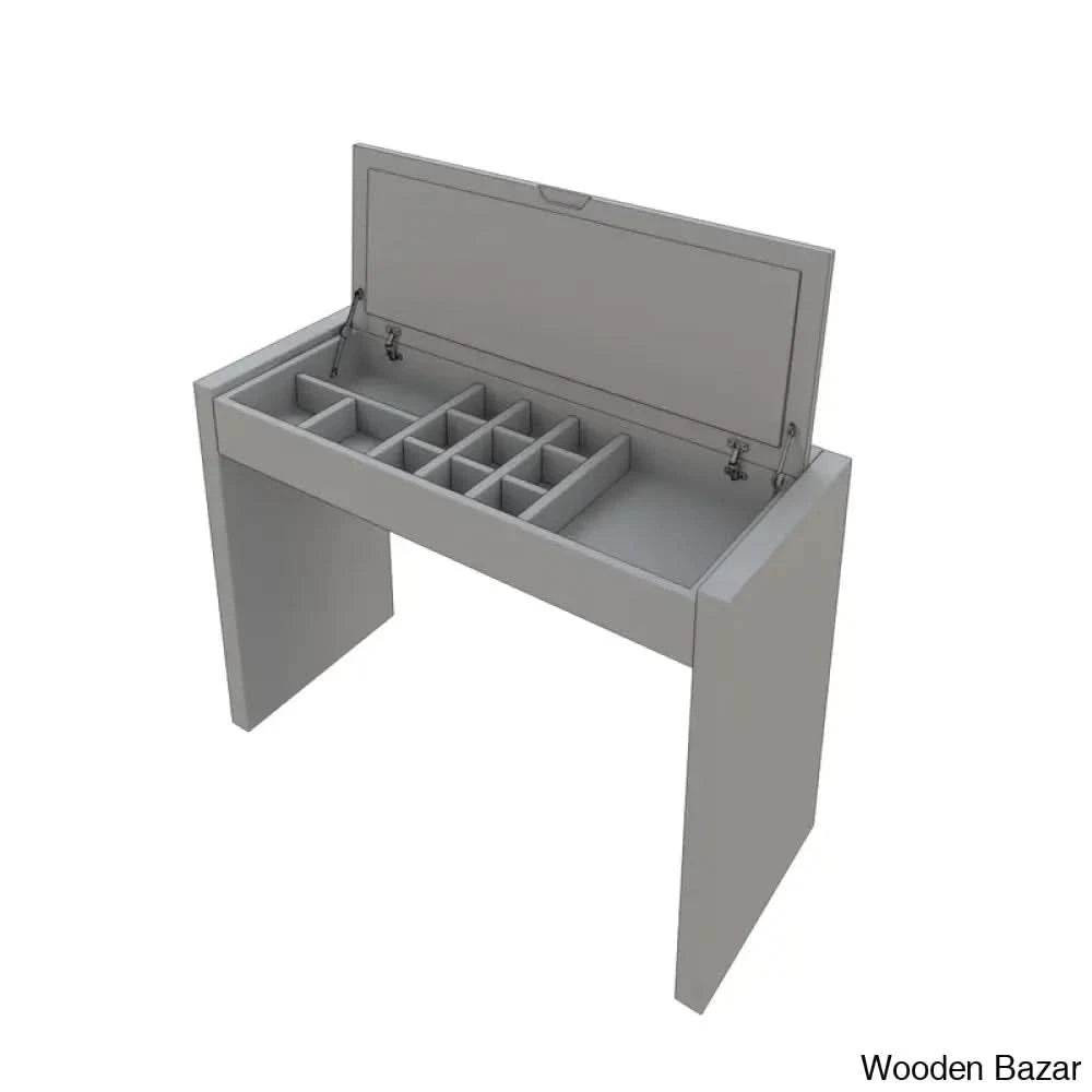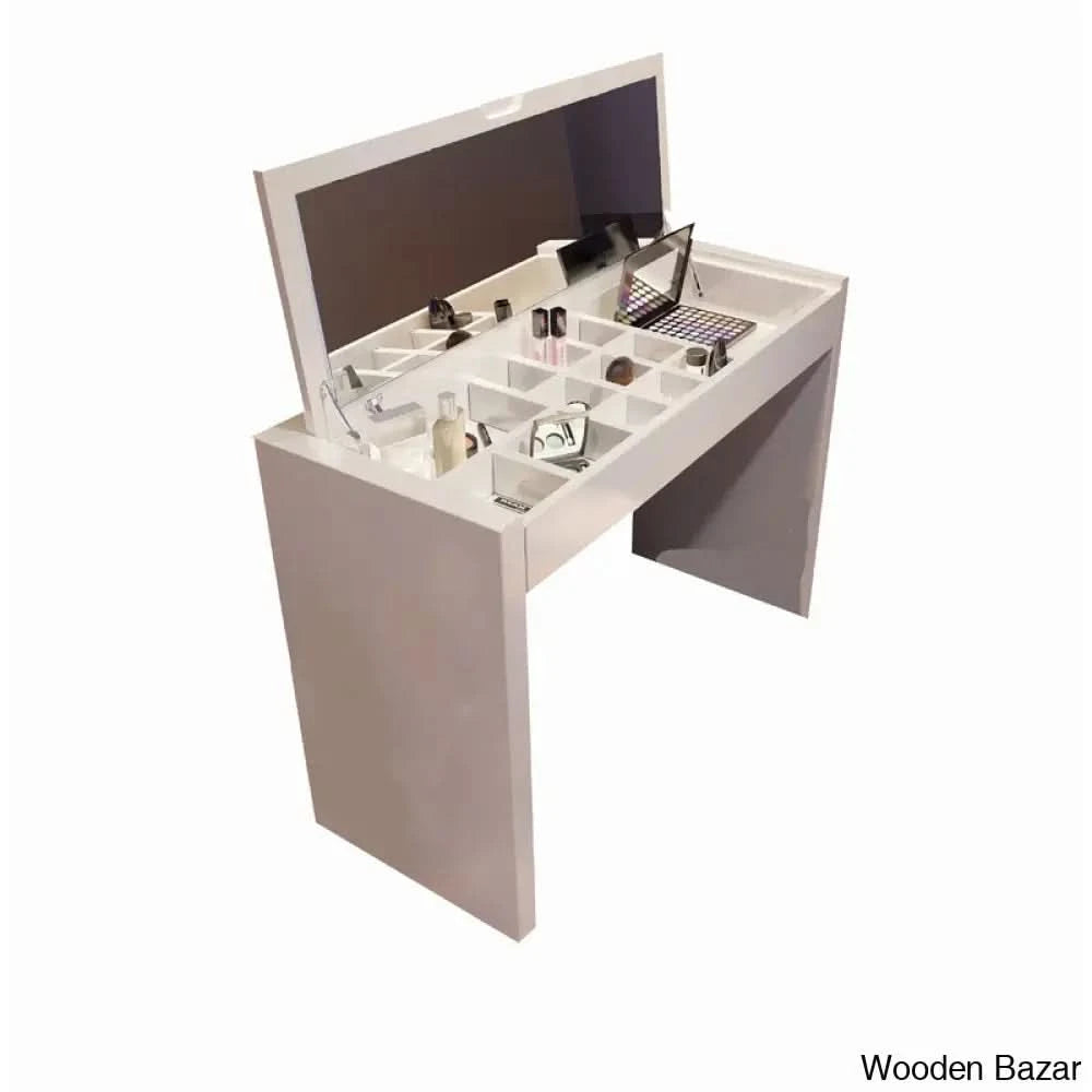 Enhance the glitz, elegance, convenience, and style of your living area. There are three variations of this lovely matte finish makeup vanity set: the vanity alone, the vanity and stool combination, or the vanity, stool, and mirror set with LED lights. The flip-top base doors open to expose a roomy storage compartment. With partitions in a shiny silver finish, the whole top base serves as a storage space that enhances your organization. This exquisite cosmetics vanity boasts a charming, distinctive style. The hue maintains the vanity's elegant and tidy appearance. With a simple button press, the visually appealing LED lights on the vanity set mirror come on.