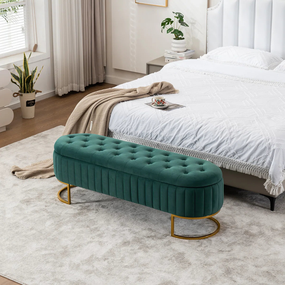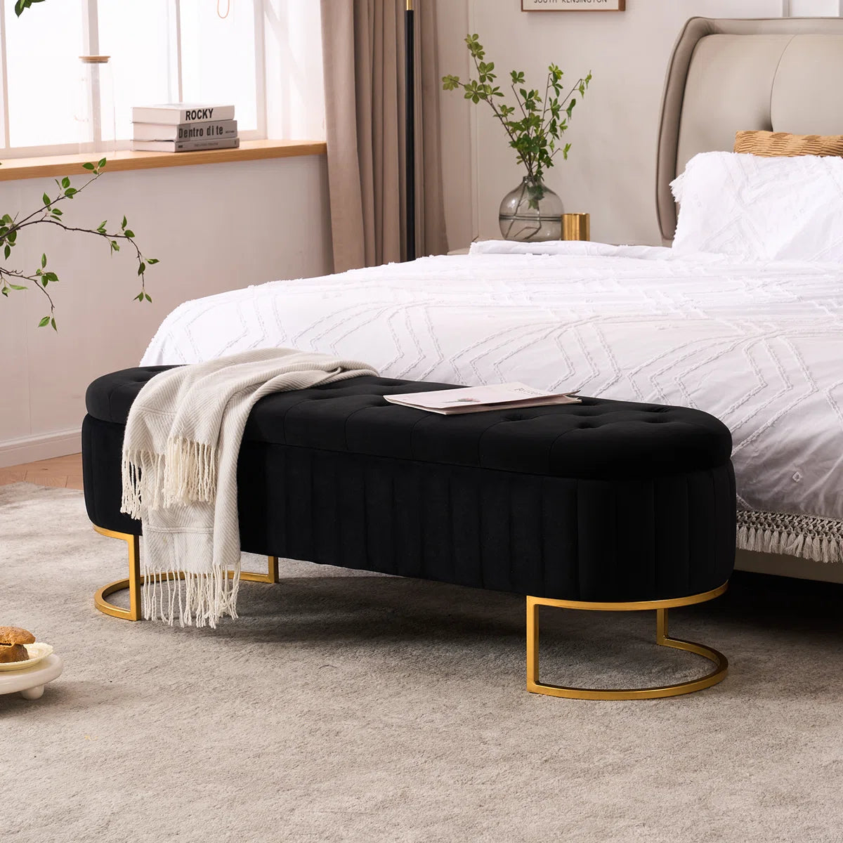 In summary, this oval velvet storage ottoman is a stylish and functional piece that brings together luxury, texture, and practicality. Its design elements, like the velvet, tufting, and gold accents, make it a statement piece for any modern home, while the hidden storage adds significant utility.